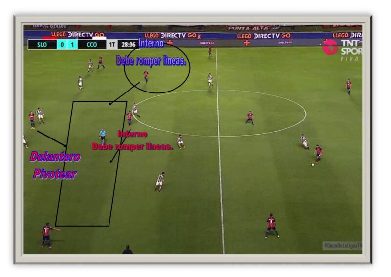 1. Frente a rivales que se abroquelan en su campo, se debe distraer por un costado, hacer ancho el juego y romper la línea media de presión rival más que nada con los volantes interiores con diagonales de afuera hacia adentro, ademas el pivoteo de un delantero centro.